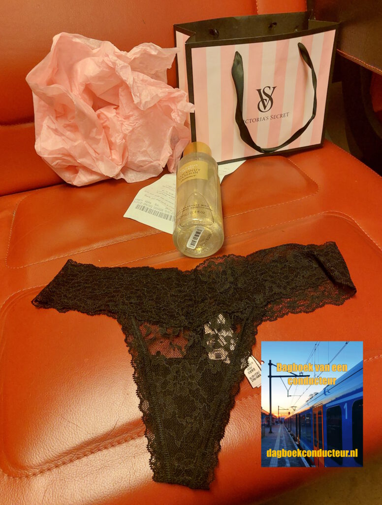 ‘Nou, daar gaat iemand géén leuke avond beleven,’ grapt mijn collega wanneer ik het tasje van Victoria’s Secret op de stoel naast hem zet en de inhoud ervan aan het bekijken ben. Ik heb het tasje net ervoor op het balkon gevonden onder een klapzitting. Geen reiziger in de buurt, want de trein is net geëindigd in Assen door geplande werkzaamheden en nu zijn we leeg onderweg terug naar Zwolle. We bekijken de inhoud en zien dat die vandaag nog gekocht is. Iemand heeft het laten staan in de trein en is zonder de aankopen naar huis vertrokken. Ik maak een foto voor de database met gevonden goed en maak een vindnummer aan. Na aankomst in Zwolle breng ik het tasje onder de nodige aandacht van wat collega’s die me ermee zien lopen naar de kast met gevonden voorwerpen. De collega’s van Tickets&Service zullen het tasje morgenochtend registreren, waarna de rechtmatige eigenaresse zich binnen vijf dagen aan het loket kan melden om het terug te krijgen, voordat het naar het centrale depot in Utrecht wordt gestuurd. Misschien een leuke bestemming voor hun volgende date? Het is weer eens wat anders dan de bioscoop…